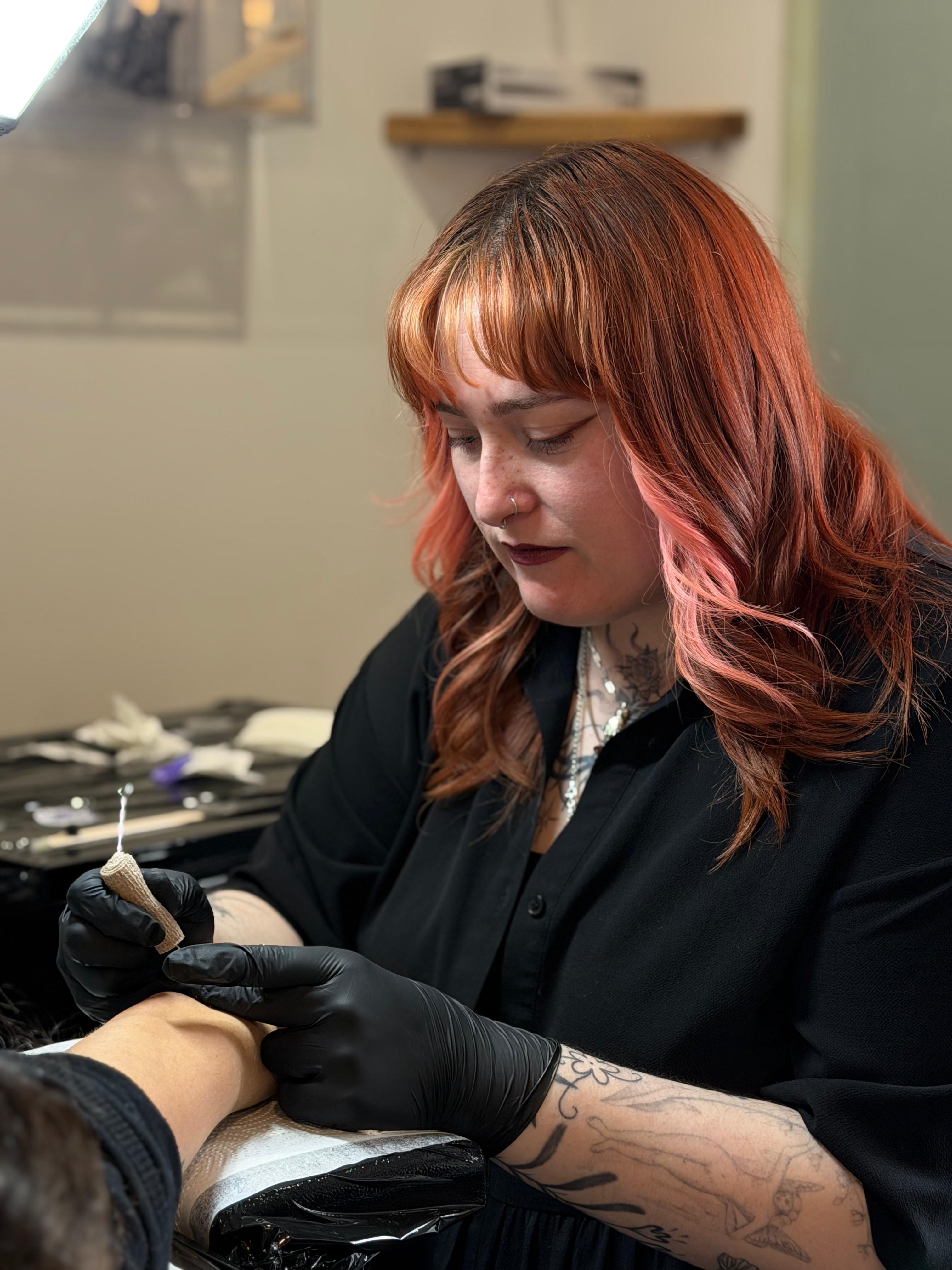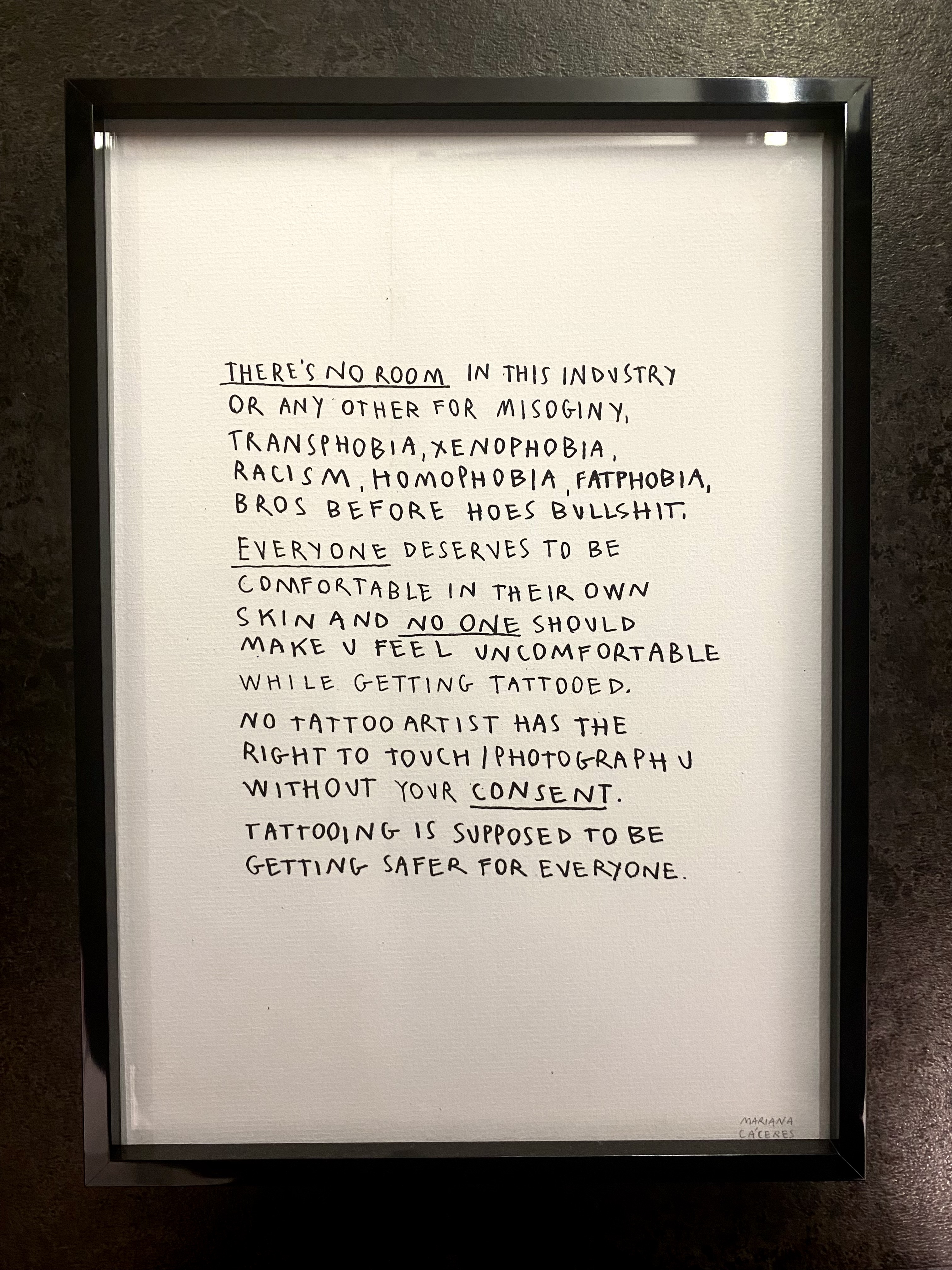 As a group we are actively engaged in conversations surrounding Intersectional Feminism, Body Politics, Ableism, Gender Politics, Racism, Mental Health and Class both individually and within the tattoo industry.